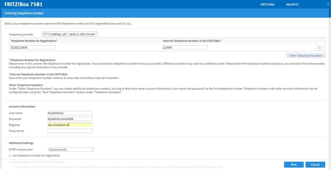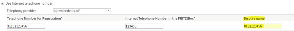 1. De bovenste regel bestaat uit het telefoonnummer inclusief landnummer en kengetal en het abonneenummer die je in je telefoons gebruikt. Verderop vul je de gegevens in die je van voicedeals hebt gekregen (naam, password en SIP-server)